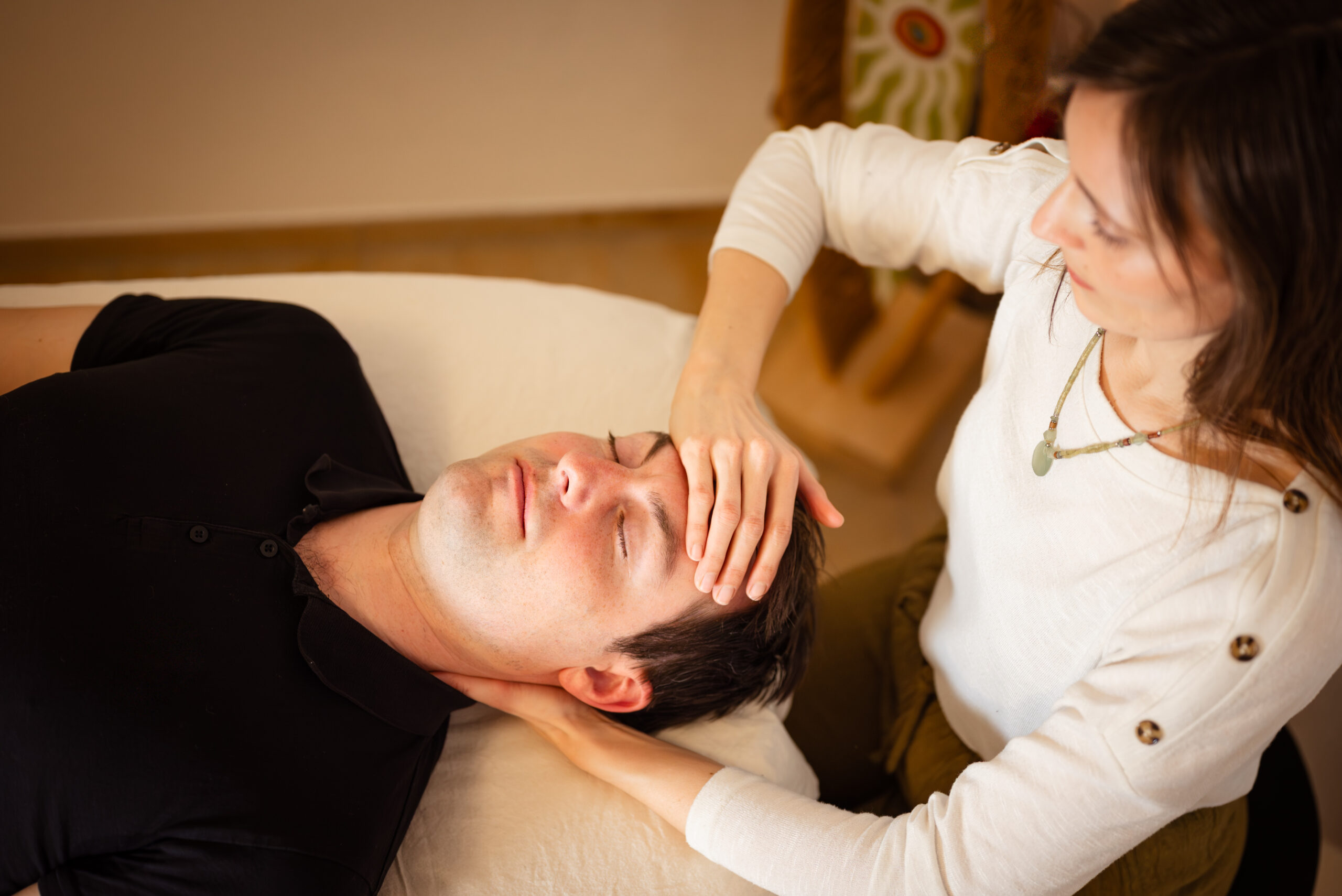 Die Anwendung erfolgt in der Regel im Liegen auf einer Behandlungsliege. Sie bleiben dabei vollständig bekleidet, idealerweise in bequemer Kleidung. Ich arbeite mit sehr feinen, achtsamen Berührungen – meist an den Füßen, Kreuzbein, Rücken, Nacken und am Kopf.